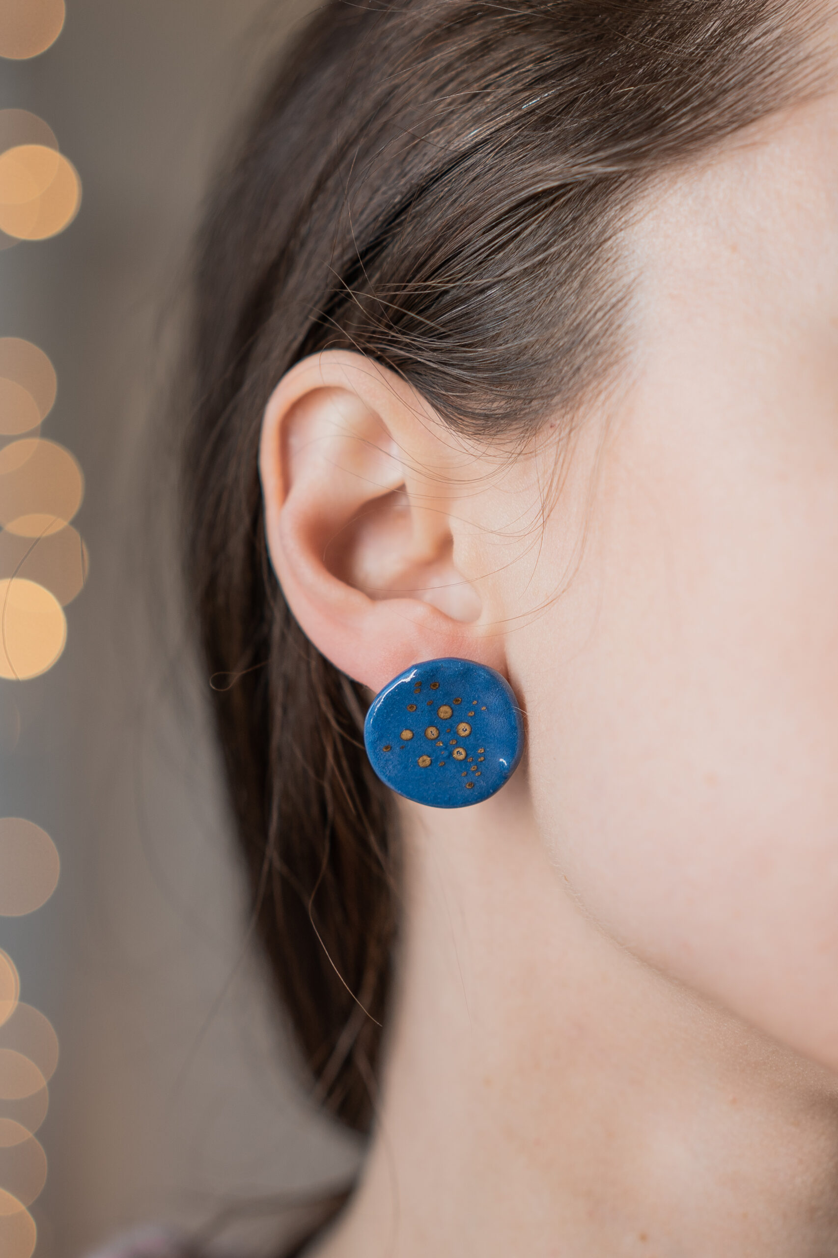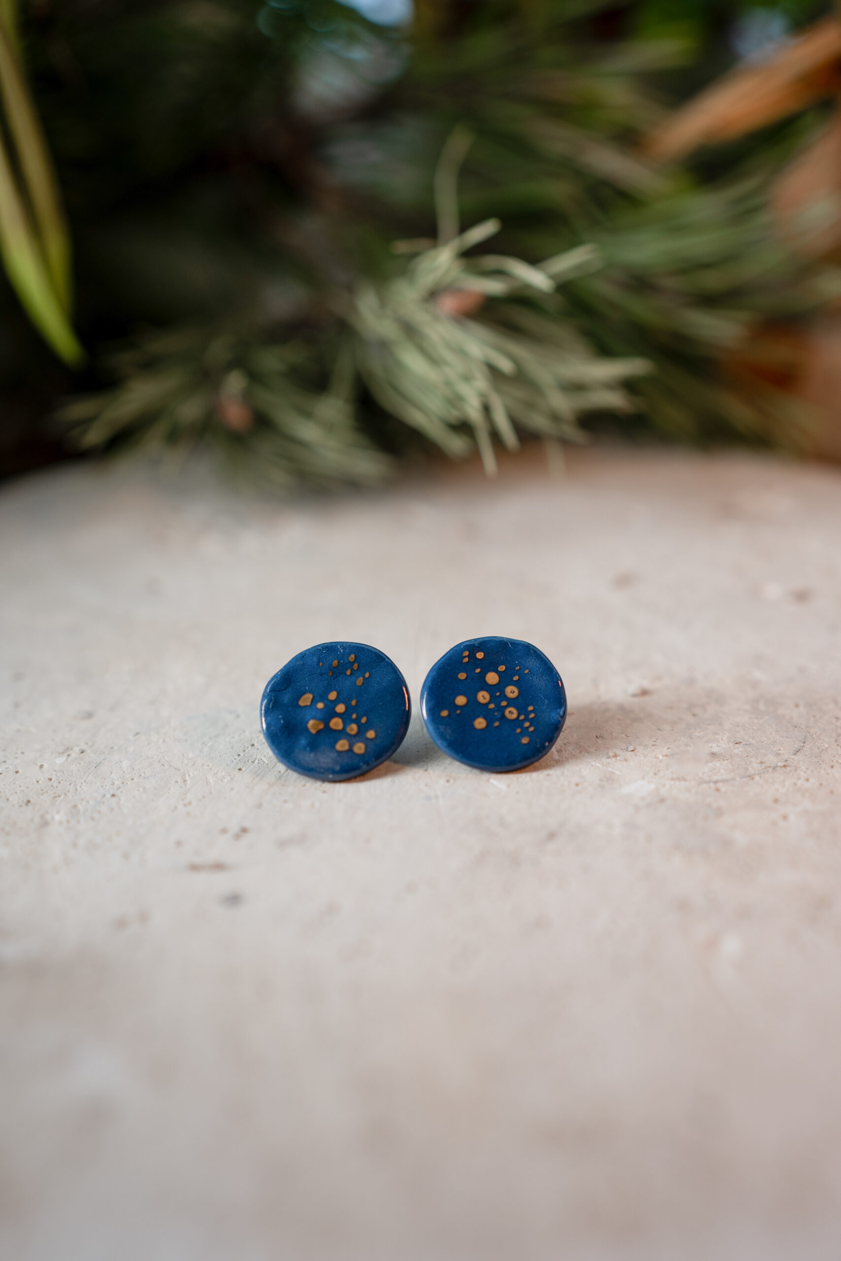 Ceramiczne kolczyki sztyfty. Średnica 2cm. Sztyft wykonany ze stali chirurgicznej z silikonową zatyczką. Kolczyki pokryte są złotem w wybranych fragmentach i wypalone w piecu trzykrotnie celem utrwalenia kolorów, szkliw oraz złota. Każdy egzemplarz jest ręcznie formowany, malowany i zdobiony, co sprawia, że nie powstanie drugi taki sam produkt. Kolczyki mogą delikatnie różnić się od siebie kształtem oraz ilością i układem złotych akcentów.