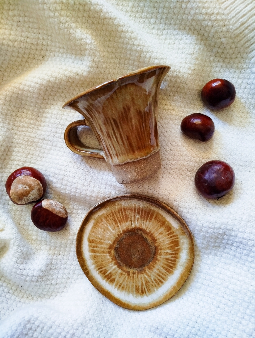 Filiżanka z podstawką Kurka z uszkiem  wykonana z najwyższej jakości masy ceramicznej pokrytej karmelowym szkliwem.