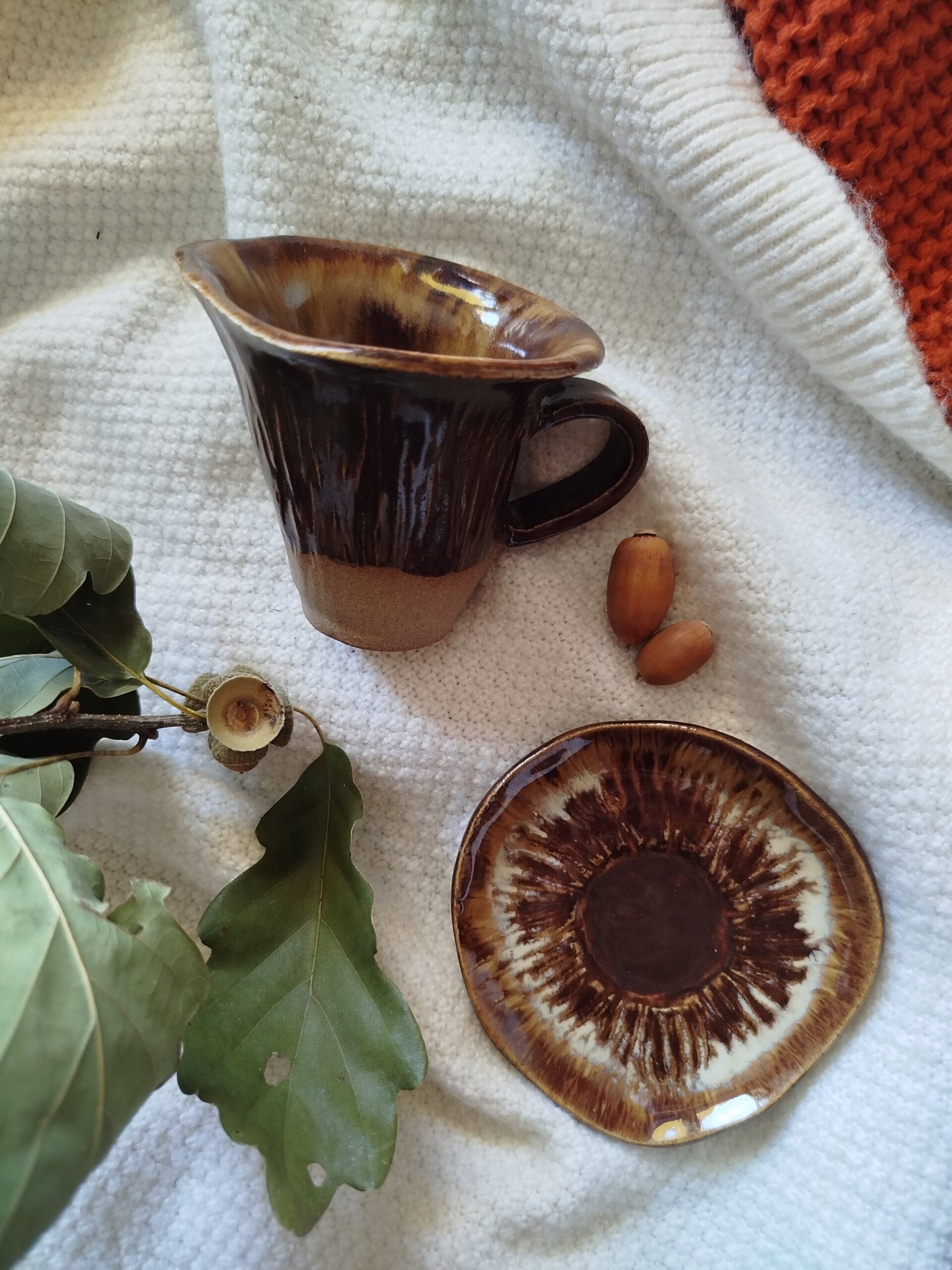 Filiżanka z podstawką Kurka z uszkiem wykonana z najwyższej jakości masy ceramicznej pokrytej czekoladowym szkliwem z karmelowymi przebarwieniami wewnątrz. Pojemność 100ml.
