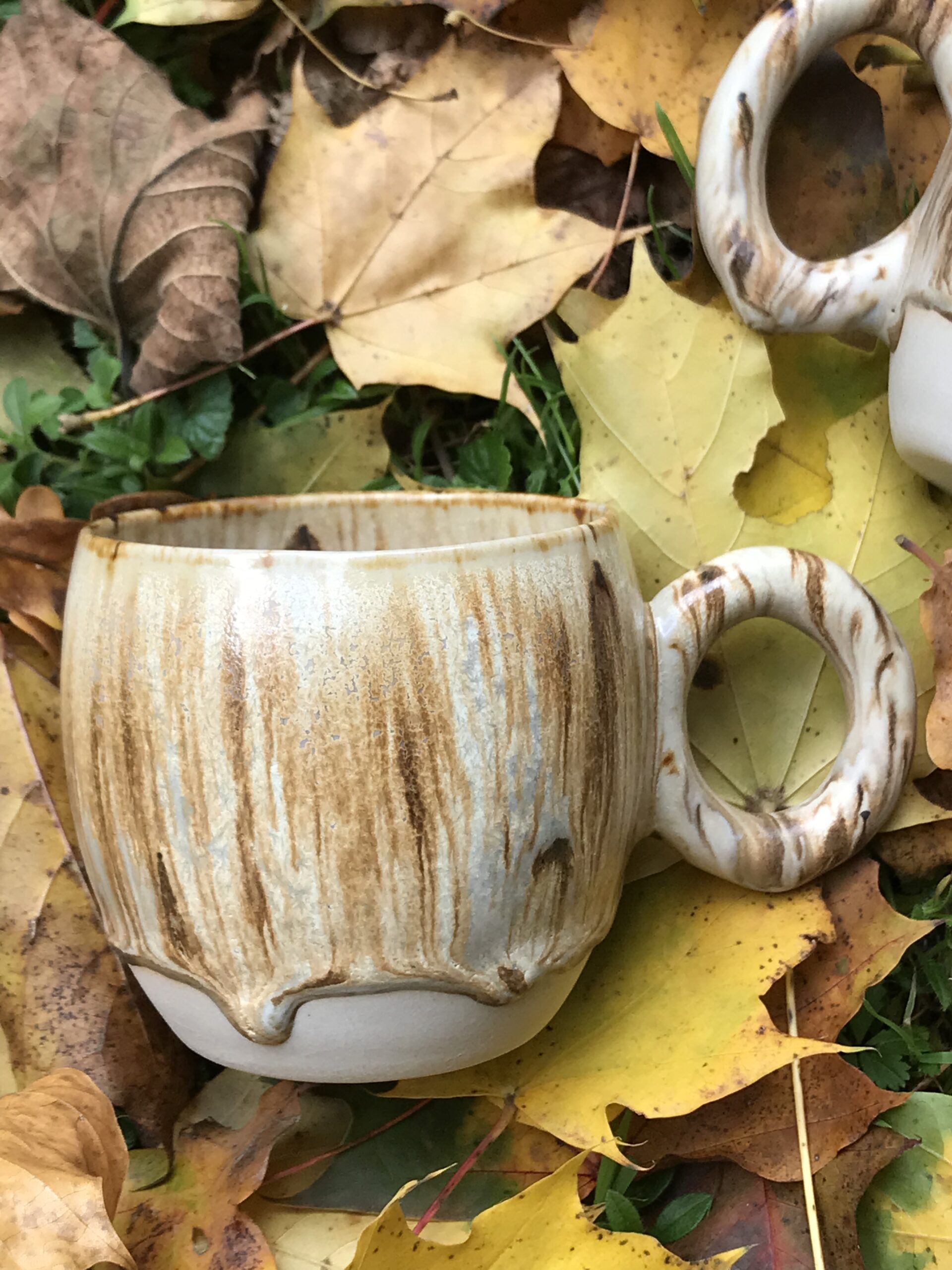 Kubek z okrągłym uszkiem wykonany z wysokiej jakości masy ceramicznej, pokryty szkliwem w środku białym błyszczącym, na zewnątrz matowo-satynowym w kolorze beżowym z czekoladowymi spływami.